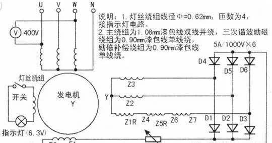 柴油發(fā)電機(jī)組實(shí)質(zhì)是臺(tái)三次諧波自勵(lì)磁凸式三相四線同步發(fā)電機(jī),因具有輸出功率大、適合移動(dòng)等優(yōu)點(diǎn),故廣泛用于廠礦、工程施工等場合。雖然功率不同的發(fā)電機(jī),其繞組數(shù)據(jù)有所不同,但電路連接基本相同。